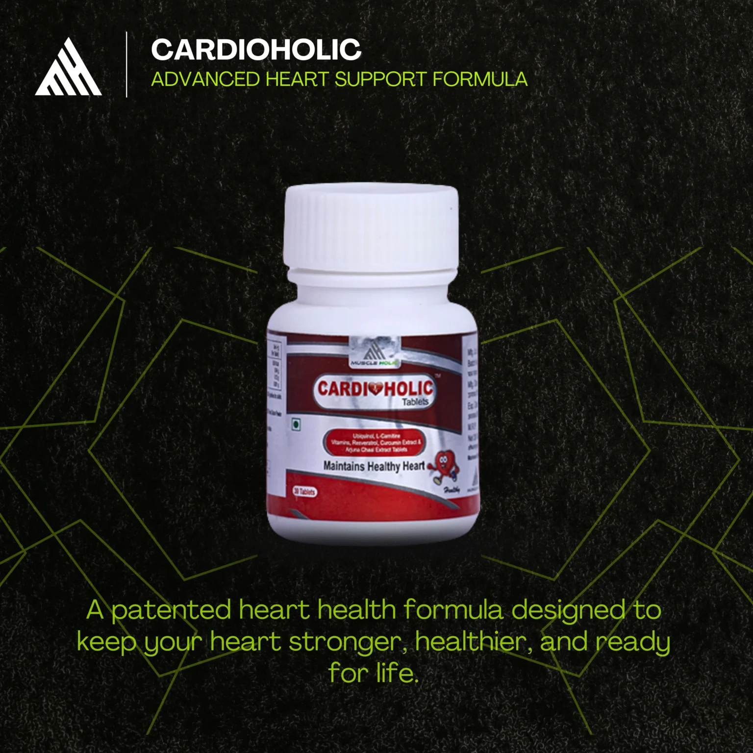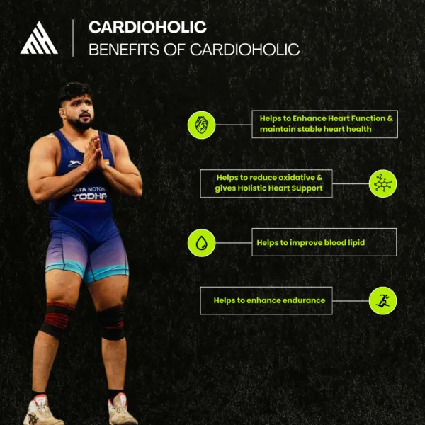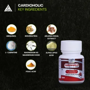 Cardioholic Gold is a premium heart health supplement designed for athletes and fitness enthusiasts. Powered by natural ingredients like CoQ10 (Ubiquinol), Curcumin, Magnesium, and Arjuna, it helps boost cardiovascular performance, support heart cell strength, manage blood pressure and cholesterol, and protect against the stress caused by intense training or PED use. Formulated with precision and proudly made in India, it’s your heart’s strongest ally on your fitness journey. Whether you’re pushing through intense workouts or navigating the demands of daily life, Cardioholic keeps your heart performing at its peak. Its nutrient-rich formula nourishes and protects your cardiovascular system, helping you sustain energy, stamina, and resilience. By promoting healthy circulation and reducing oxidative stress, it not only supports physical performance but also safeguards long-term heart health. Make Cardioholic a part of your daily routine and experience the confidence of knowing your heart is stronger, healthier, and ready for every challenge.