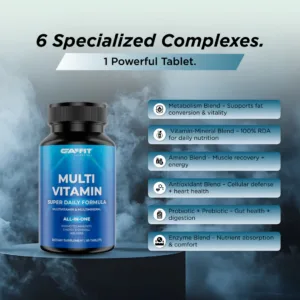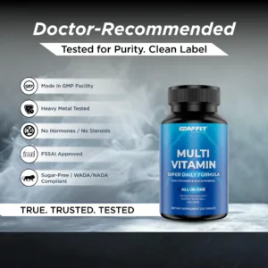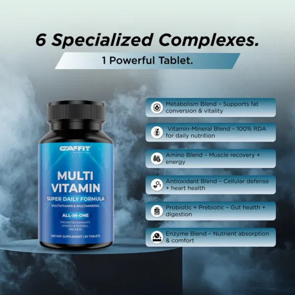 GAFFIT MULTIVITAMIN is a supercharged all-in-one daily wellness supplement formulated for both men and women. With 100% RDA of essential vitamins & minerals, it delivers comprehensive support for immunity, metabolism, energy levels, bone strength, and brain function. Infused with probiotics, digestive enzymes, amino acids, antioxidants, and herbal extracts like Ginseng, Ginger, and Lycopene, this advanced formula fuels your body from the inside out. Ideal for active lifestyles, work stress, poor diets, or recovery support.