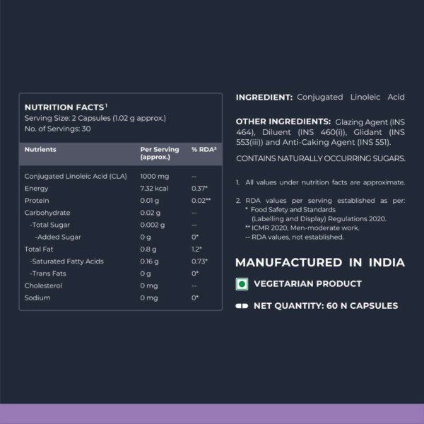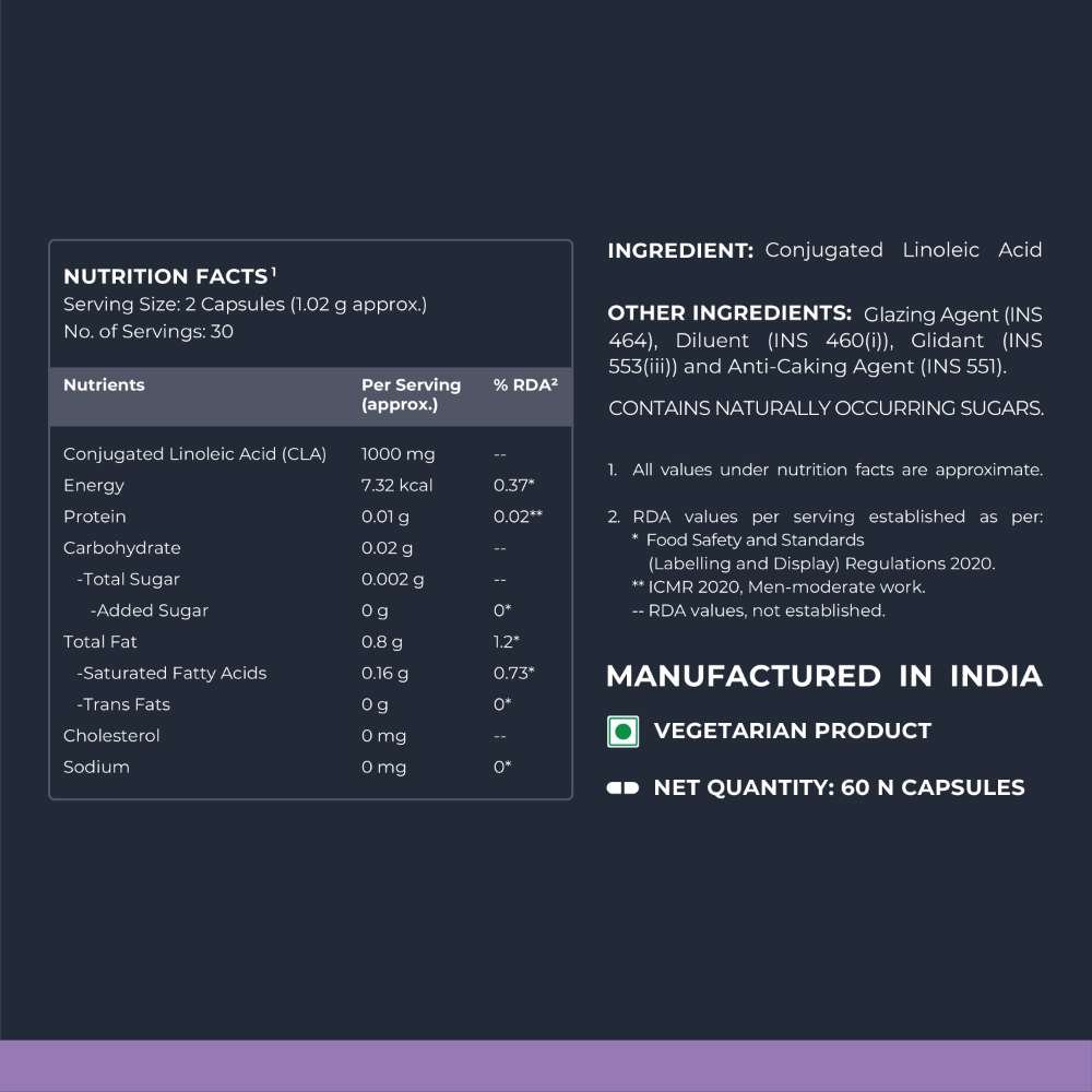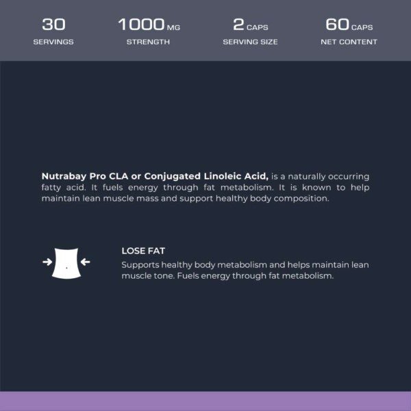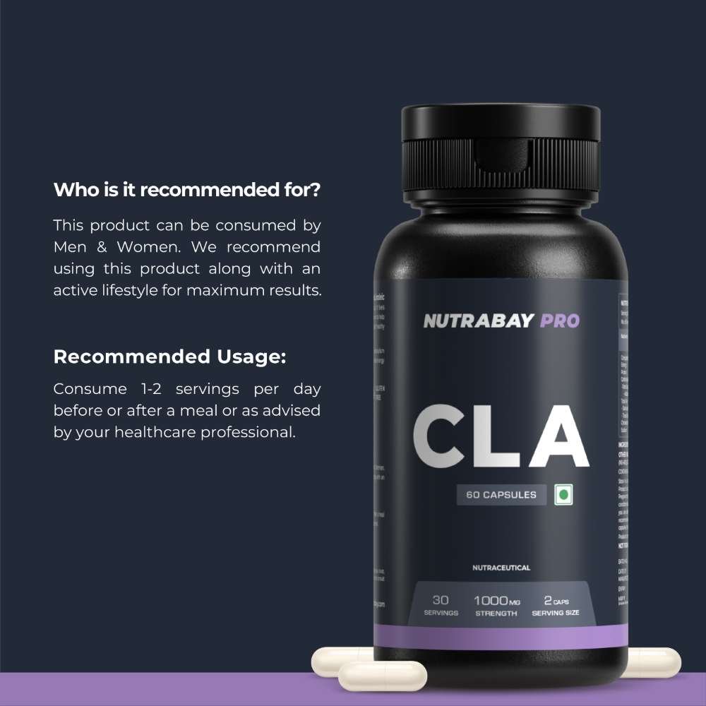 Nutrabay Pro CLA or Conjugated Linoleic Acid is a naturally occurring fatty acid. It fuels energy through fat metabolism. It is known to help maintain lean muscle mass and support healthy body composition.