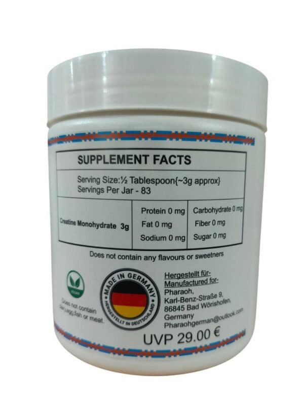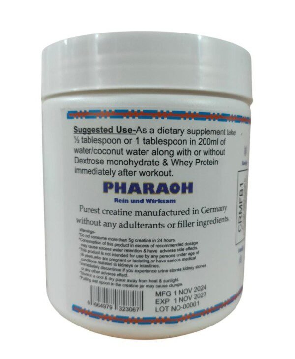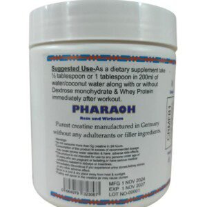 Boost your workouts and enhance your performance with Pharaoh Creatine Monohydrate, meticulously crafted in Germany. Each container provides 83 servings of pure, high-quality creatine, designed to help you increase strength, improve muscle mass, and expedite recovery. Ideal for athletes and fitness enthusiasts alike, this product delivers unparalleled results, ensuring you reach your fitness goals faster than ever. Elevate your training and conquer every challenge with Pharaoh Creatine Monohydrate!