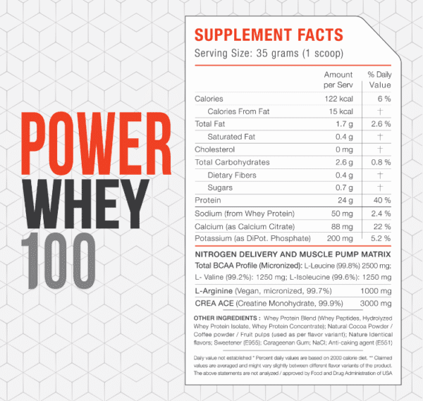 Power Whey 100 is designed for athletes and fitness enthusiasts seeking maximum muscle growth and recovery. Each serving delivers 24 grams of high-quality whey protein, crafted to provide a potent blend that supports lean muscle mass and accelerates recovery post-workout. With Nitrogen-enabled muscle building, this formula includes a powerful Nitrogen Delivery and Muscle Pump Matrix, enhancing nutrient absorption and delivering a remarkable muscle pump that fuels your workouts with unmatched energy and stamina.